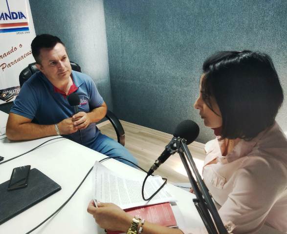 Vereadora Marenilce sendo entrevistada pelo jornalista Joacir Suzin da Rádio Matelândia, convidando para o evento da Procuradoria da Mulher.